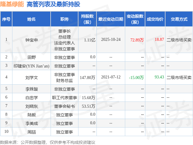 隆基绿能的高管列表及最新持股情况如下: