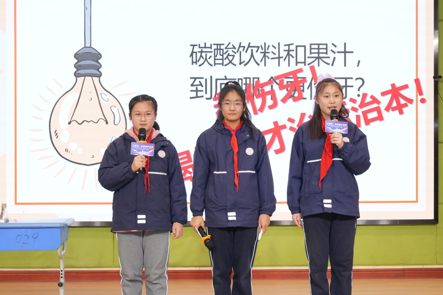 碳酸饮料和果汁,哪个更伤牙?……上海市姚连生中学学生王馨赟、胡籽言、王烁镱以情景剧形式引入,打破思维定势,将日常生活中可获得的鸡蛋壳模拟牙齿,通过两次实验说明:果汁和碳酸饮料对鸡蛋壳都存在一定的腐蚀性,且果汁对蛋壳腐蚀性更大些,引起现场观众的兴趣。同学们通过对比实验,分析日常饮食中的科学,唤醒健康生活意识,提出最好的办法就是少喝饮料、多喝水。