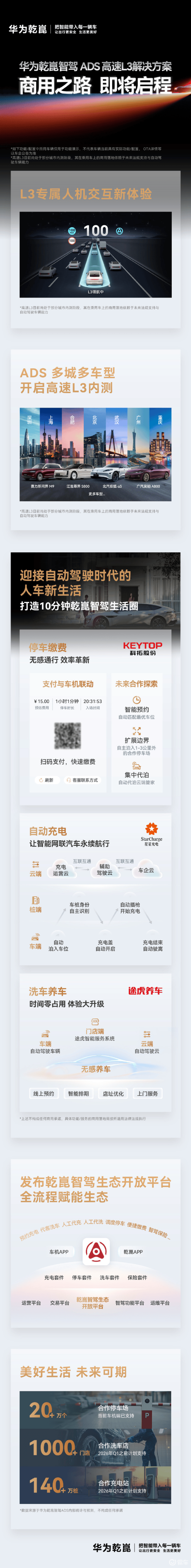 具体来看,华为乾崑智驾ADS高速L3解决方案包括:L3专属人机交互新体验;高速L3内测;打造10分钟乾崑智驾生活圈以及乾崑智驾生态开放平台。